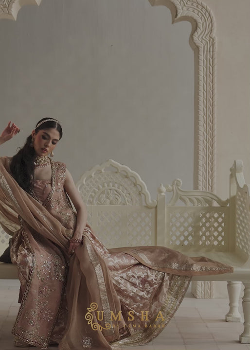 An opulent long jacket crafted from luxurious silk meysuri, adorned with intricate, heavy handwork that shimmers with artisanal finesse. Paired with gracefully flared paneled palazzos for a touch of fluid elegance, and a finely embellished hand worked bustier.