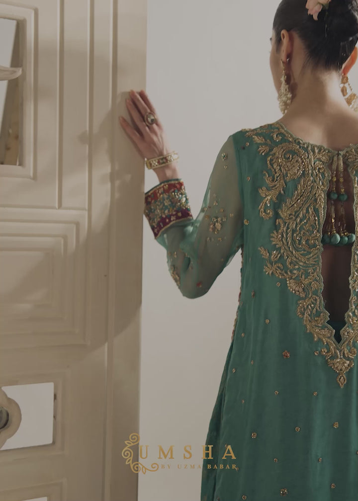 Exude timeless grace in this elegant long shirt ensemble, crafted from pure organza and adorned with full intricate handwork. The outfit is paired with crushed paneled palazzos, designed from rich fabric and enhanced with detailed embellishments, adding flow and volume for a regal, flattering silhouette.