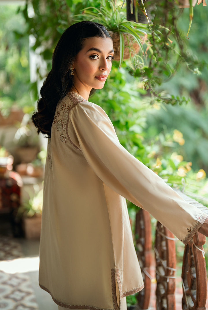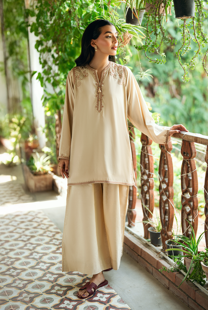 Gulzar set features a short relaxed shape kurta with an embroidered front and back neckline paired with loose culottes for an effortless casual feel. Model is wearing Small size