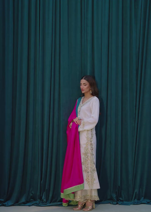 A luxe velvet sugar drizzle long kurta with graceful v neckline ,finished with pastel toned floral embroidery along the neckline ,sleeves and hem. Its a soft feminine fall ideal for casual chic or a polished everyday look .its has pockets ,and a contemporary thread work that steals the spotlight .it is paired with a colorful dupatta magenta -apple green - teal to compliment the embroidery and paired with a pure silk culottes with work on it . it has some Indian tanka booties to give it a Suttle and elegant which completes the look of the shirt .