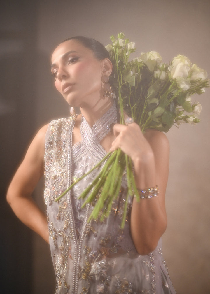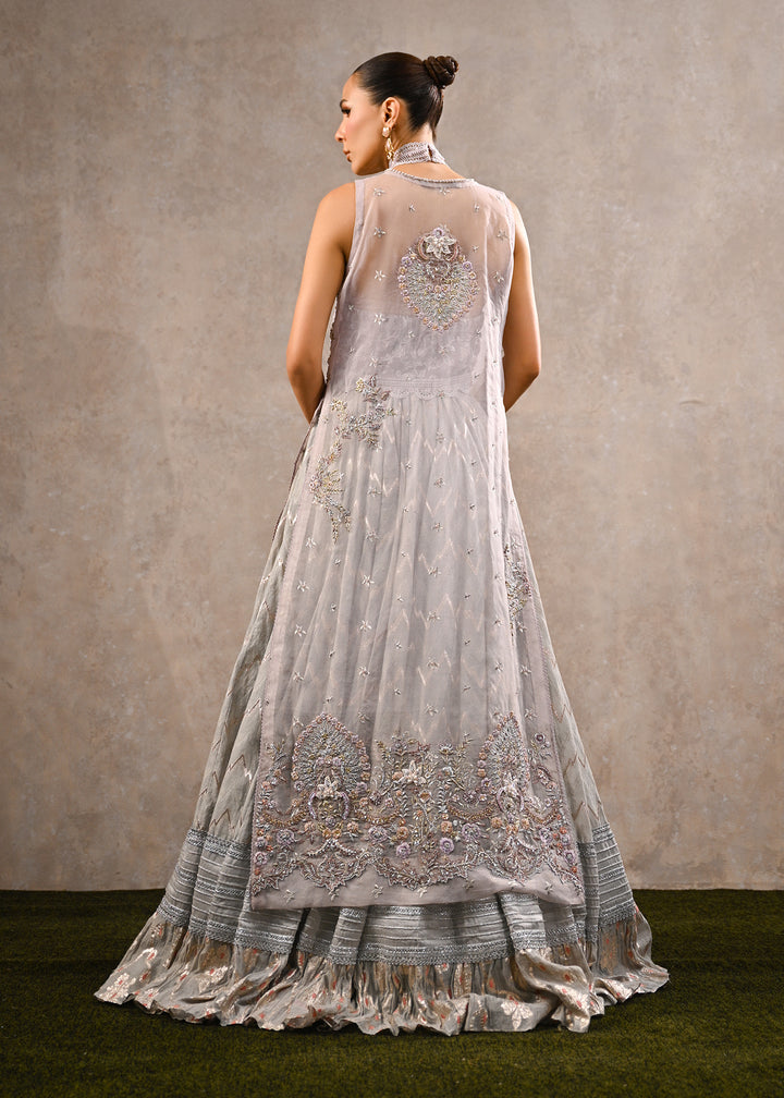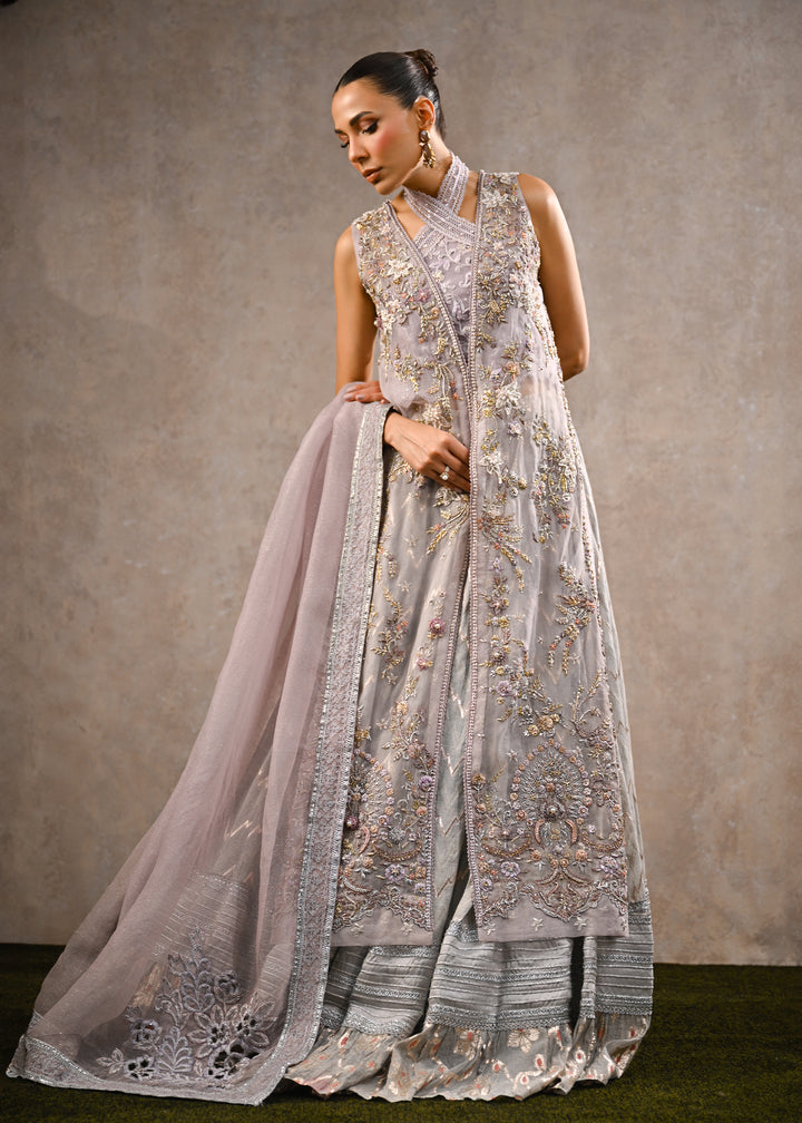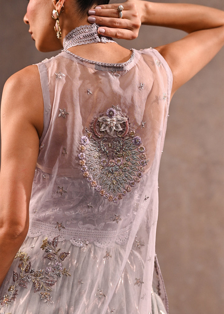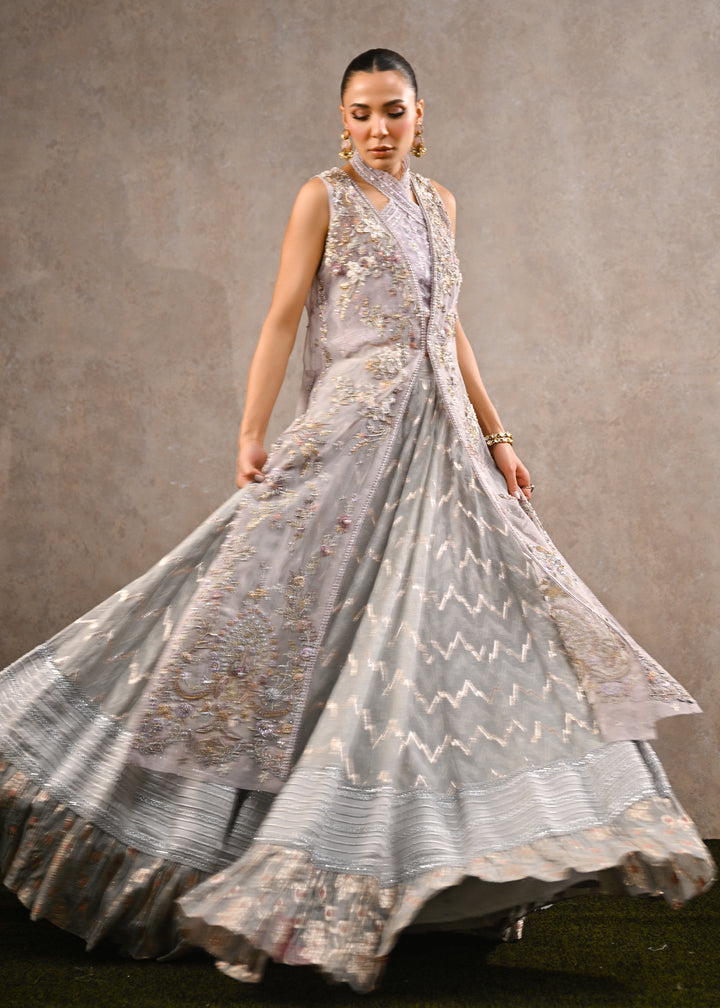 A symphony of pastel perfection — this exquisite lilac ensemble blends contemporary flair with timeless artistry. The front-open jacket, crafted in layers of lilac and lavender, flows gracefully with every step, its silhouette accentuating poise and sophistication. Beneath it lies a halter bustier, intricately adorned with silver, lilac, and lavender tones — shimmering delicately under the light, creating a soft, romantic allure. The lehnga features an embossed zari jaal, a testament to meticulous craftsmanship, with cascading ruffles and lace details that add volume, texture, and a dreamy fluidity.