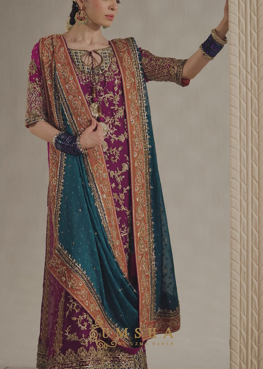 This stunning ensemble is a celebration of traditional Hyderabadi style, infused with vibrant multi-colored hues. The outfit features a flowing, beautifully crafted long shirt adorned with intricate patterns inspired by the rich heritage of Hyderabad. Paired with the long shirt is a luxurious pure raw silk izaar. The hem of the izaar showcases exquisite handwork, featuring delicate embroidery and embellishments. The crowning jewel of this ensemble is the dupatta, a masterpiece in itself. Fully loaded with intricate handwork, the dupatta is finished with meticulous attention to detail.