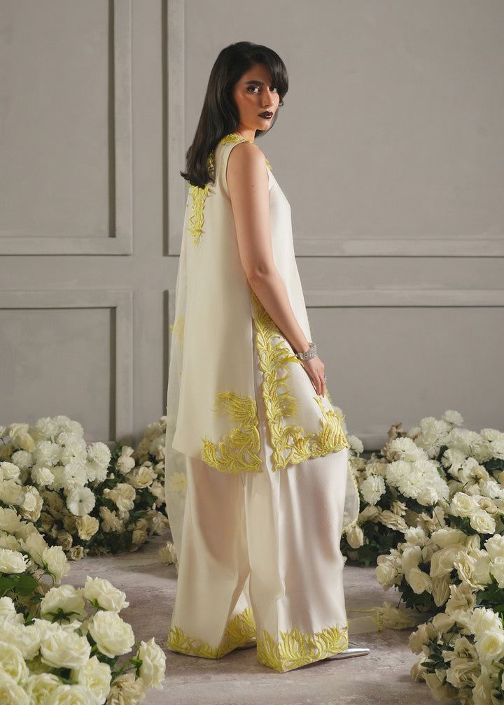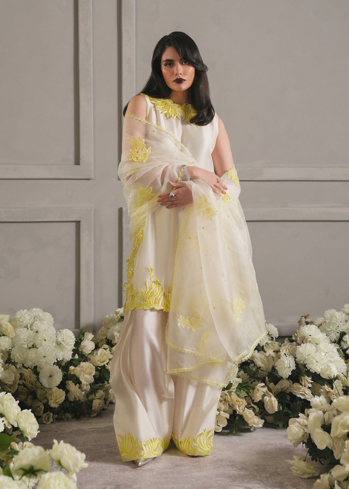 This ensemble exudes elegance with a refreshing modern vibe. The soft ivory canvas is brought to life with bold yellow embroidery that creates a striking contrast, while a delicate, sheer overlay adds a contemporary, ethereal touch. The intricate needlework with pearls and cut dana makes it an expression of modern refinement veiled in timeless grace. Paired with a pure silk Farshi shalwar and an organza dupatta finished to perfection, striking the ideal balance between chic and timeless.