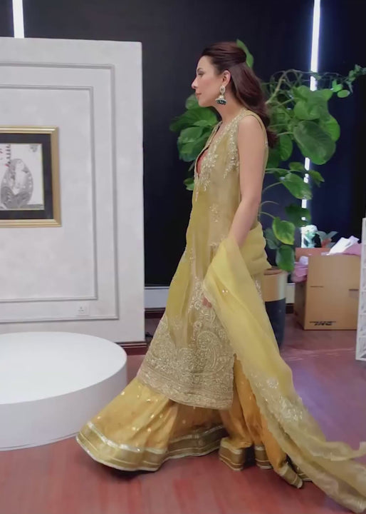 Drenched in gold elegance,a timeless silhouette adorned with intricate handwork and regal charm , its a flowy straight cut shirt of pure paper lama Mysore paired with pure kathan silk palazzos and pure organza dupatta and a rustic orange kathan bustier with gold details, all gold embroidery with intricate handwork of kora dabka ,perfect for those who love a touch of tradition with modern grace.