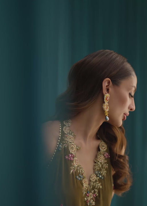 A luxe velvet halter shirt adorned with gold zari floral embroidery and hand embellishment all over. The front short slit features an elegant embellished border. Paired with loose velvet palazzos finished with a gold zari border. Completed with a pure silk dupatta featuring an elegant bunch for a refined, luxurious vibe.
