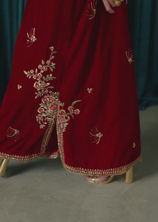 A luxe red velvet kaftan with effortless drape, paired with cotton net straight pants with intricate gold zari on the neckline, daman, and chok, and detailed hand embellishments throughout. Floral bunches on the neckline and daman add a touch of regal charm.