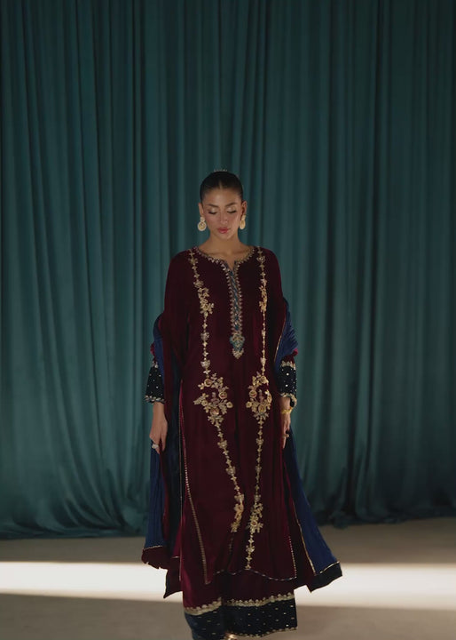 A luxurious maroon velvet long kurta adorned with intricate antique-gold embroidery running symmetrically along the front .The neckline features delicate handwork ,adding a regal touch ,while the teal embellishment cuffs brings a striking contrast to the rich velvet texture paired with a pants with the same contrast teal embellishment border and a crush double shade dupatta with velvet finishings which completes the over all look of the shirt ,perfect for winter weddings and evening celebrations .
