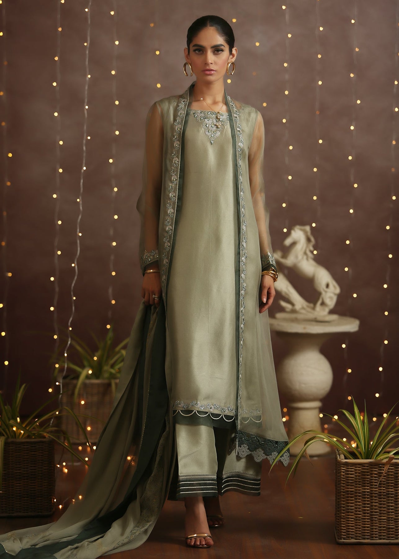 Enhance the beauty of this look with our pure organza jacket with intricate resham embroidery, pure chiffon dupatta gives a delicacy to this beautiful block print border. paired with pure raw silk culottes gives a delicate finishing with pure organza, to complement your look.