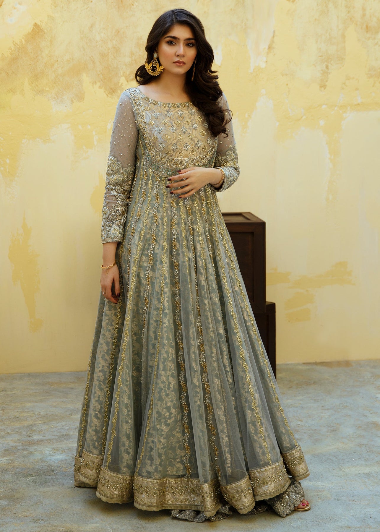 Misty blue pure french net paneled floor length anarkali showcases shimmery embellished atlas bodice highlighted with resham ,kora,Dabka,pearls and crystals. Panels have alternate kaamdaani embellishment and zardozi details on the rest ,underlined with pure lurex panelled Mysore and Maroori border into hem .
