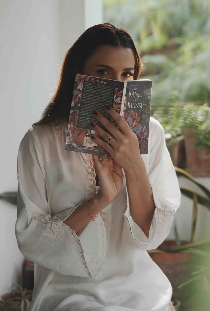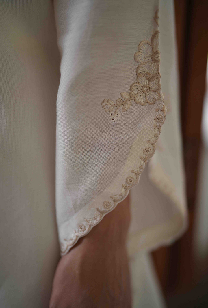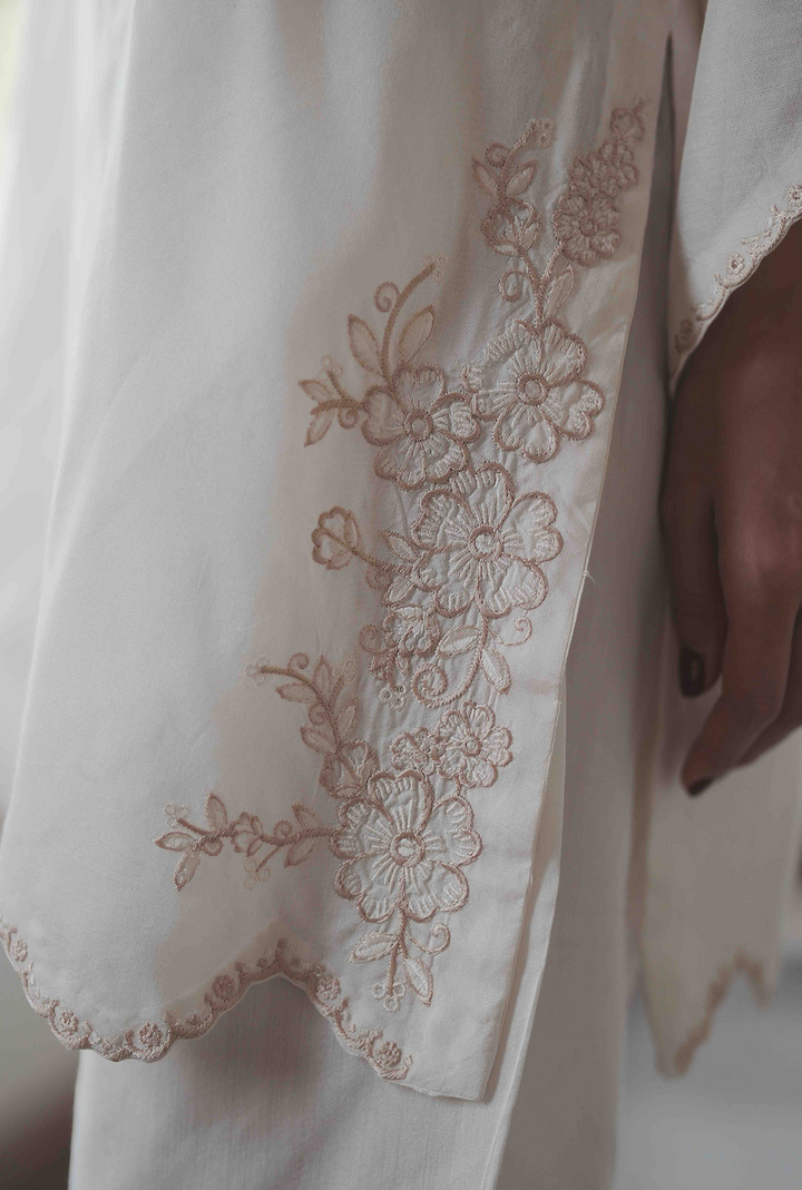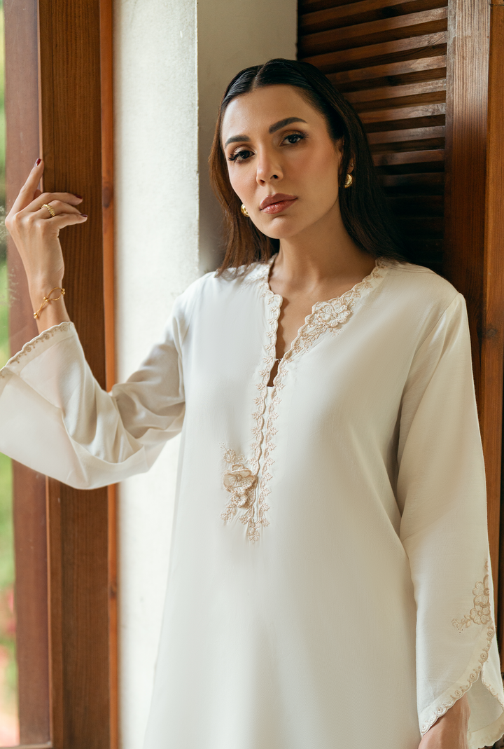 A pristine white Sufi set featuring a round neckline with a V-slit, scalloped hem, bell sleeves, and wide-leg culottes with matching minimal scalloped embroidery. Model is wearing Small size