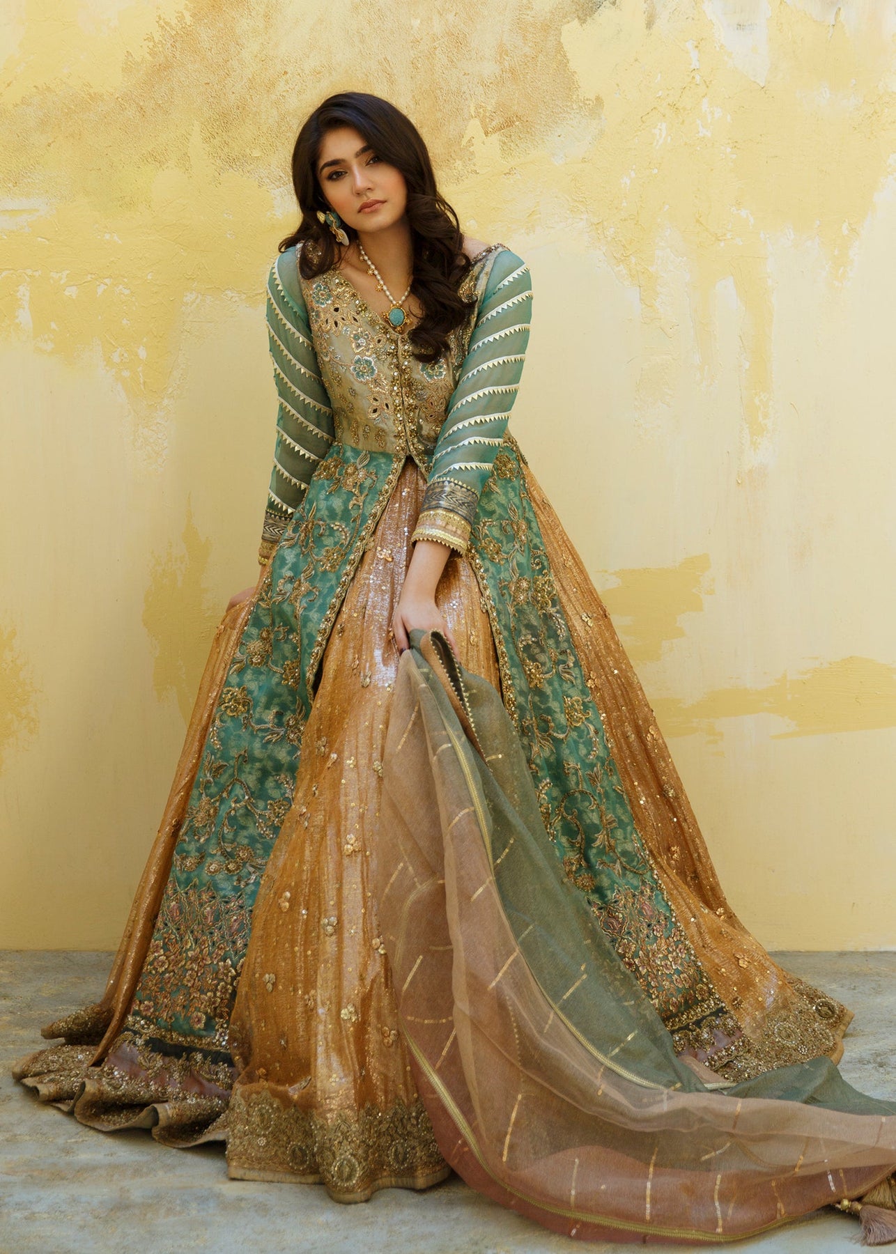 Tiffany blue pure silk Mysore front open elongated jacket embellished with hand resham,zardozi,Maroori on lame’ mysore bodice and finely framed with resham and Maroori borders .This ensemble completes with rose gold pure lurex mysore lehenga with our signature Maroori borders .
