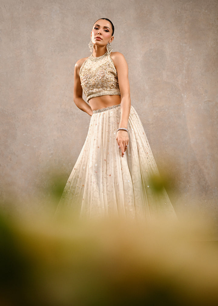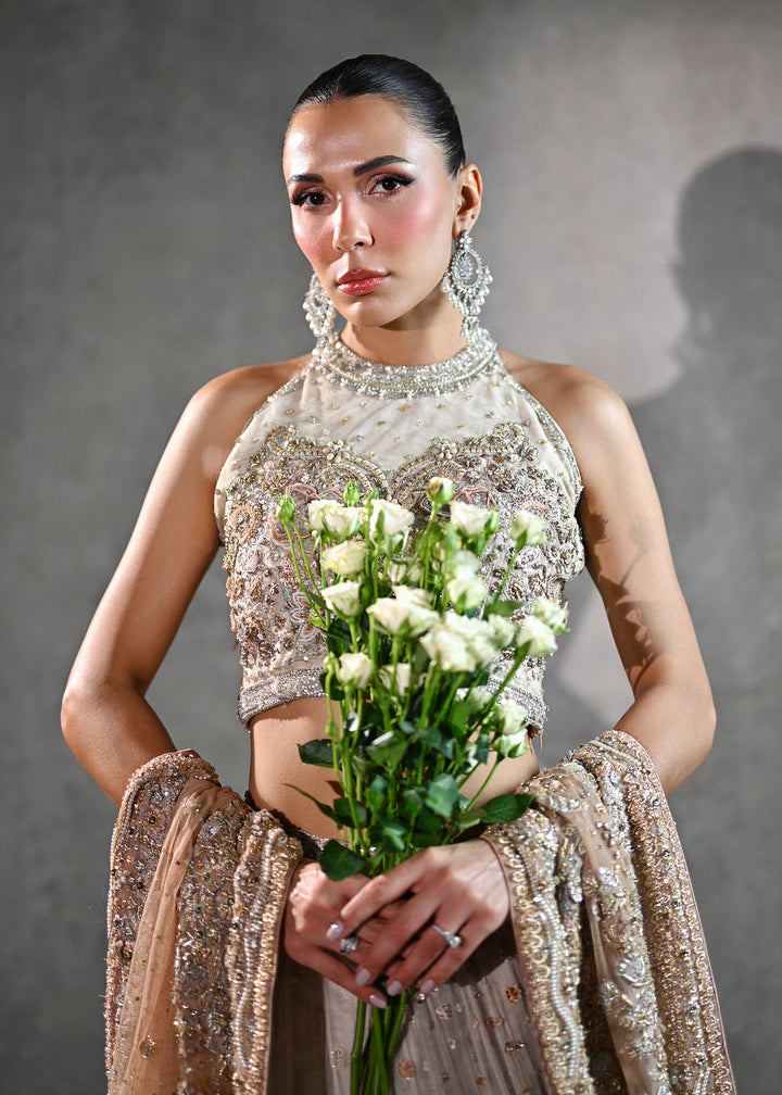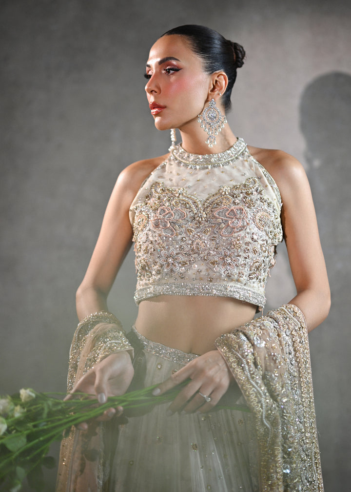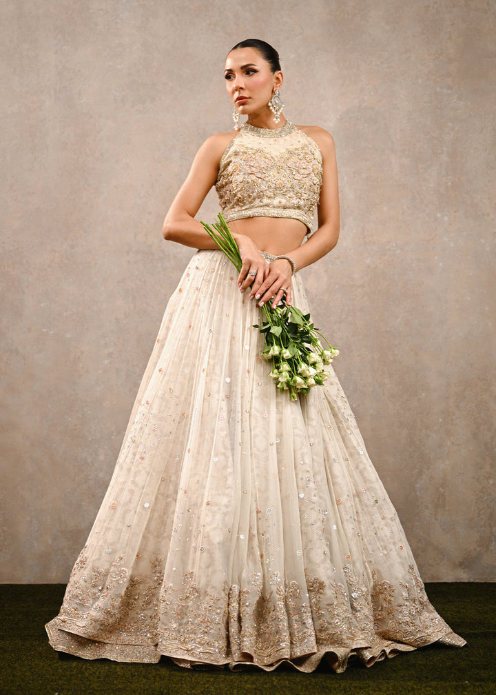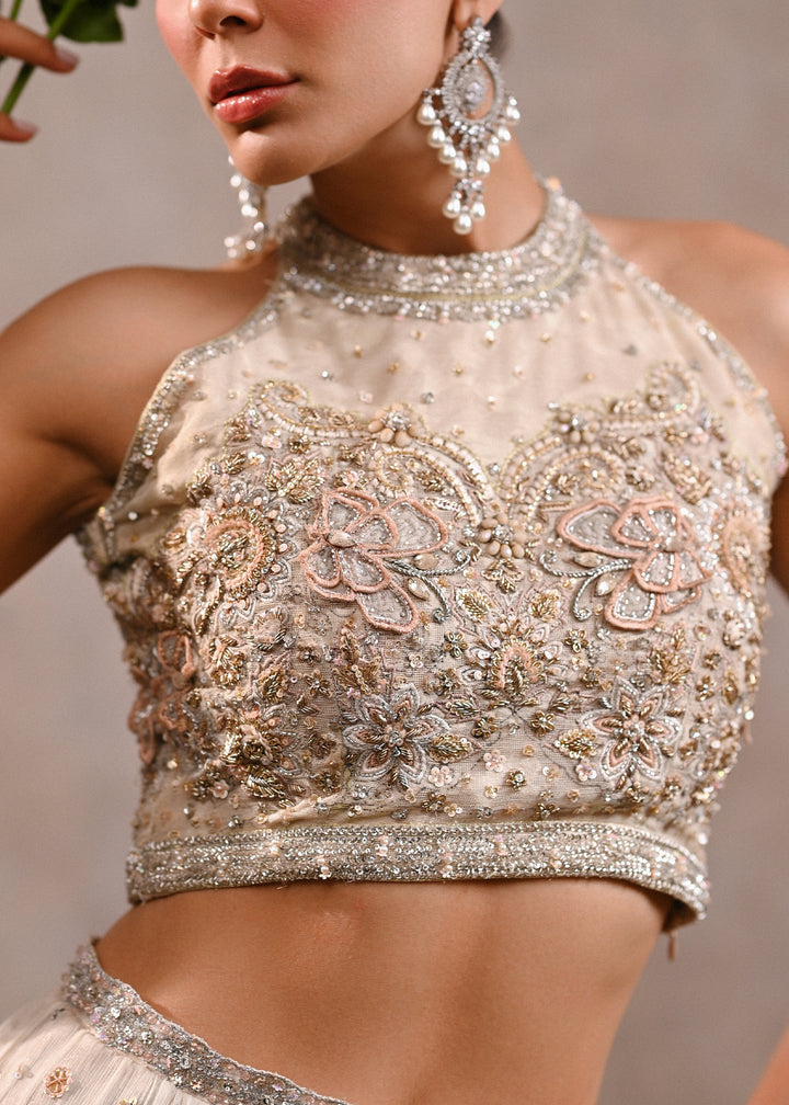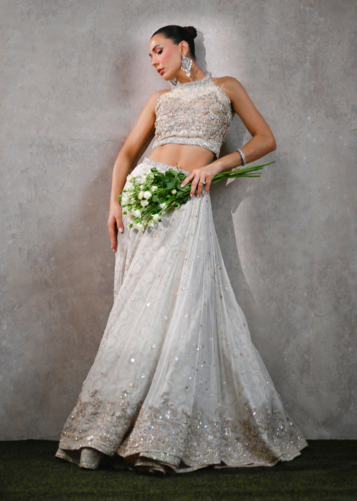 An ethereal ivory ensemble that whispers sophistication in every thread. The lehenga blooms in hues of rose and blush pink, kissed with sequins and a soft shimmer that dances with every step. A border of intricate kora dabka and French knots in rose and crimson lends a touch of regal artistry. Paired with a butterfly blouse in sugar-drizzle tones, delicately hand-embellished with crimson butterflies .
