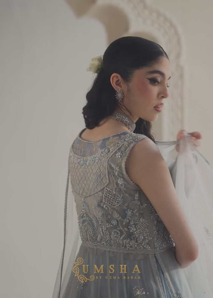 Step into timeless elegance with this exquisitely crafted two-layer ensemble, designed for the modern woman with a taste for classic sophistication. The inner layer features a graceful gown made from luxurious pure organza adorned with intricate handwork. An upper paneled front-open gown, tailored in rich pure silk meysuri, lavishly embellished with detailed handwork. The ensemble is beautifully complemented by a sheer, ethereal pure net dupatta, finished with fine hand embellishments.